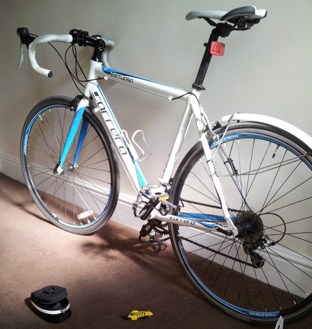 MIAUnfortunately, being an off-the-shelf Halfords Carrera job there’s no real distinguishing features, save for the grey Bontrager tyres that I fitted rather than the white / black standard ones that came with the bike. You never know though, the twat who stole her might have left the singular mudguard on there, or the saddle bag packed with various accessories and a present from my old man, a ridiculously useful multi tool. If the saddle bag is gone, there is a bracket mounted under the seat which they might have left, and I’ll know it’s mine because I did a proper bodge job on it and one of the two pieces is fitted upside down as it’s the only way I could fit it. And to think I used to be an engineer.