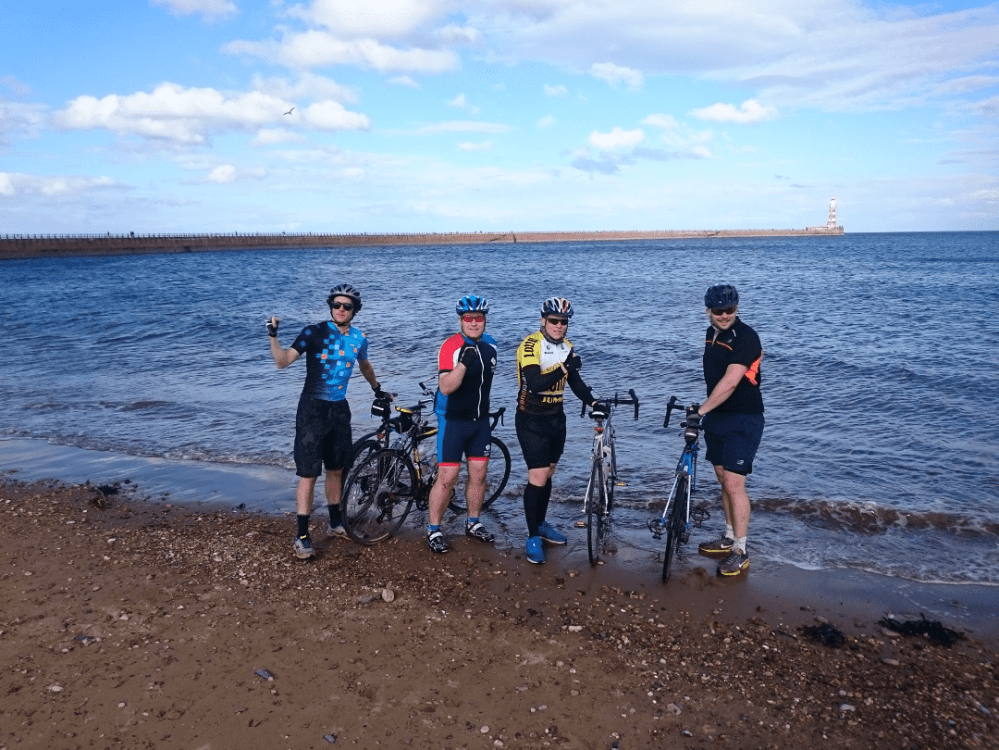 What helped the most though was the spirit amongst the four of us; a never-say-die attitude to drag ourselves and our steeds over the line. We couldn’t let those down who had backed us, and we couldn’t let Jonny down after he’d asked us to do this in honour of his old man. We were all in it together. Each of us had our share of hard times over the course of the weekend (especially the Saturday) but the fact that it was a shared struggle, all aiming for a common goal, got us through it. When I’ve been finding it difficult in various running events in the past I’ve had to summon the strength to finish from deep within; here we had to do that too, but we also had each other. A friendly face waiting at the top of each hill, encouraging us on with a fistful of malt loaf or a handful of jelly babies. The second day on the early climbs, riding alongside each other in pairs on the quiet roads and chatting about all kinds of unrelated nonsense to take our minds off what was happening to our legs. Laughing at Si every time he toppled off his cleated pedals at 0.5 mph, so many times we actually can’t remember the final total. It all helped and it was an absolute honour riding together, all of us finally out there, cycling the Coast to Coast in memory of Neil Scott. Exactly how Jonny wanted it when he asked us back in February 2015.