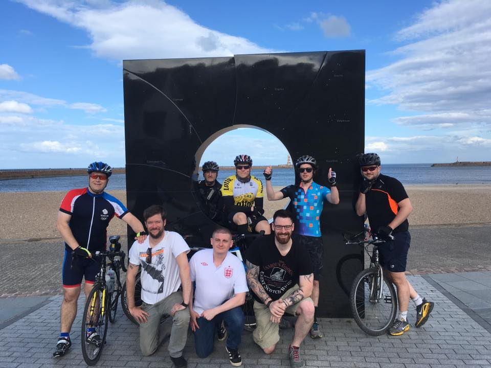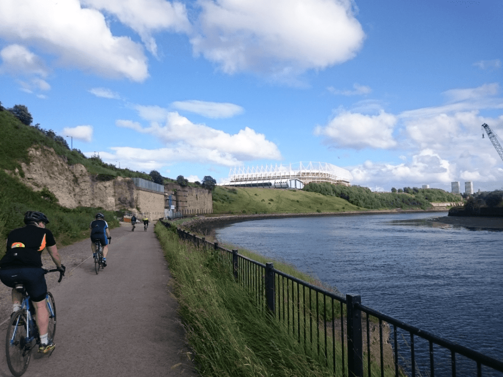 We could ride two abreast, we could chat. We could (almost) relax. The sun was out. The pace was swift but the riding, compared to what had gone before, was easy. It was probably the best part of the entire weekend. OK so we nearly killed a loose dog running across the path on a blind bend but other than that it was fantastic. We were feeling strong, we knew the finish line was getting closer by the minute. We began to recognise landmarks – the Penshaw Monument high up on the hillside, the Stadium of Light. Spinning along the banks of the River Wear, the salty estuary air telling us we were close to our goal.