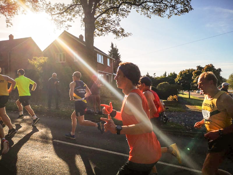 We set off down the ridiculously fast start straight and then almost immediately up that bastard hill they chuck in straight after. It’s always bloody horrible but thankfully short and this year I was nicely distracted by my Mum and my sister stood on the side of the road and screaming about Glastonbury tickets as I ground my way up. Over the crest of the hill and then – bliss. I do love the first half of this race, especially on a morning like this. Gliding serenely along the country lanes of Hertfordshire with clear blue skies overhead and a lovely crisp chill in the air. The leaves on the trees turning yellow just about to drop. Best of all, gradually downhill and I watched the mile splits dropping off one by one: 6:14, 6:08 then a ridiculous 5:58. I only needed to hit 6:26 per mile to get the magic sub 40 but everything was coming together even better than I had intended. I went through halfway only a handful of seconds over my fastest ever 5k and then mile four came in at 6:11. What the bloody hell was happening here?