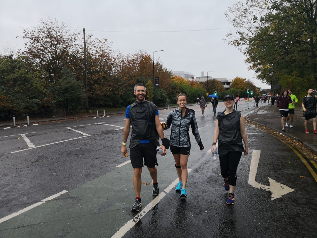 I didn’t have much time to reflect on things though as I needed to get changed and head down to see the others finish. The weather had taken a serious nosedive and the usually-refreshing free pint at the end didn’t really hit the spot as I stood there just longing for a cup of tea to wrap my cold, numb hands around. I had a great time stood on the side of the road cheering people on though and it was 100% worth it first seeing Nicola and Adam finish together, and then Jenn shortly after.
