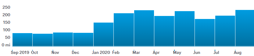 It’s pretty unprecedented. Twice before, in 2014 and 2016, I’ve been on target for a similarly big totals thanks to intensive marathon training, and then in both cases as soon as I crossed the line I pretty much gave up on running for a bit and went and did something else instead. This year, my spring marathon was postponed but for some reason I just kept on going and going and going. Marathon training started again in June: by mid July it was officially cancelled for the year. Still I kept on going, even though I almost had nothing to aim for, perhaps holding on for a possible virtual race to replace it. Running through the middle of summer like I never had before, ticking off virtual challenge after virtual challenge. At current pace, illness and injury withstanding, I should hit 2,000 miles for the year in a few weeks’ time; my previous best was 1,294.7. I’ve only gone over 1,000 three times in a year ever.
