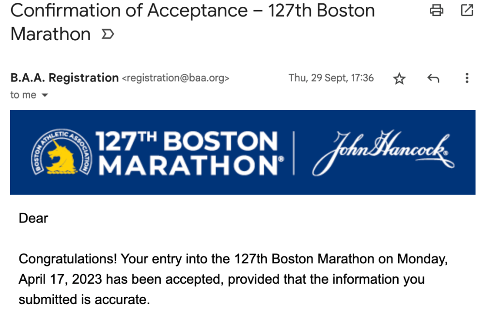 I still refused to believe it until officially confirmed, but then shortly after the news came the email. THE email. Was that unicorn in the header smiling at me? Someone was smiling at me. I was smiling at me. I was in the club. I had a golden ticket. No more marathons.