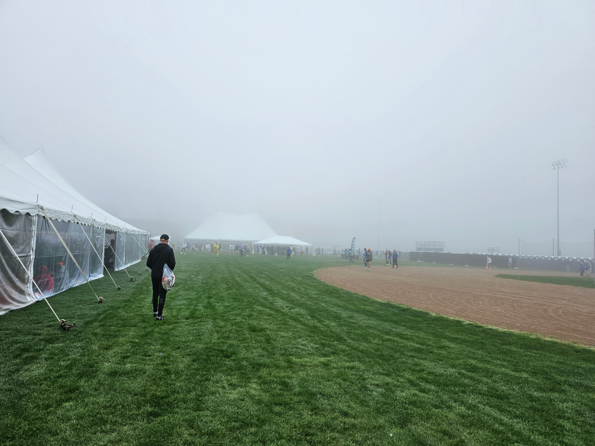 Here we all were, huddled under marquees in the morning gloom, waiting to be summoned to run while some guy whose voice I could barely make out was droning on with some probably-really-important race information over a tannoy. I half expected there to be a tombola or something on one side of the playing field, or Alan Partridge shouting FIRE FIRE, THE MARATHON’S ON FIRE in the background. People were strewn about all over the place, making chit chat to each other trying to kill the time before we all had to run all the way back to Boston. Some were even trying to get a bit of kip with one guy laying there half in a sleeping bag looking like the sort of casualty I’ve come across at the bottom of the stone circle at Glastonbury at 6am. It all felt incredibly surreal.
